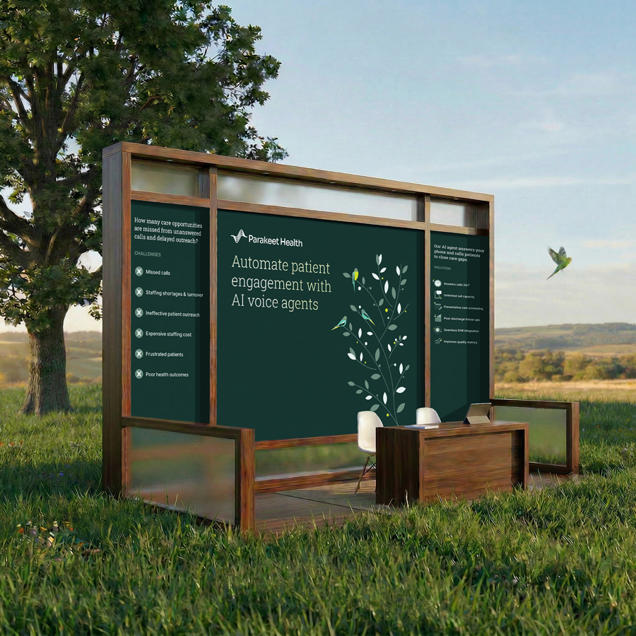 Tradeshow booth design for Parakeet Health, translating their healthcare-native, voice-first AI platform into a clear, compelling environment through custom illustration, iconography, and thoughtful messaging.
